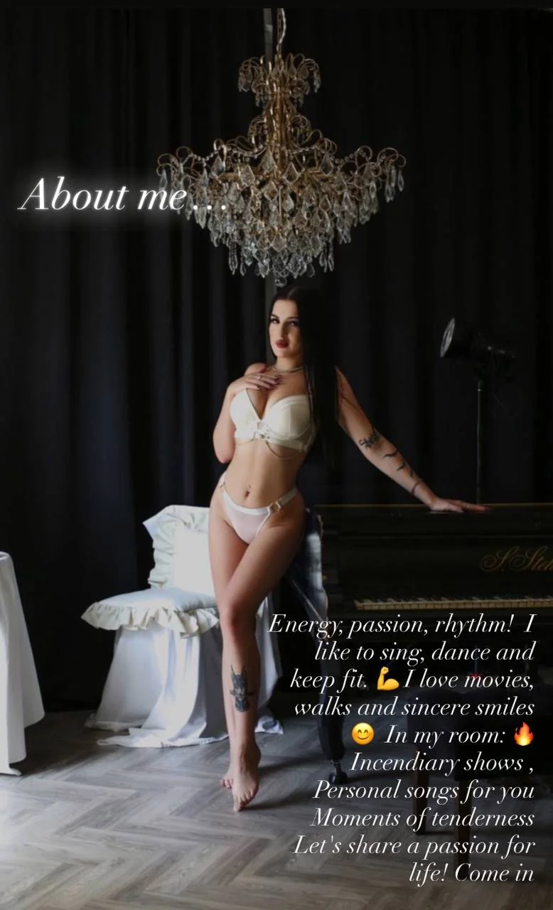 “Hello! I am a face - here to give you incredible emotions and create an atmosphere of pleasure. In public shows, I like to be playful and liberated: I dance, communicate with you, demonstrate my charisma and enjoy every moment of communication. I like to attract attention and make you smile!”