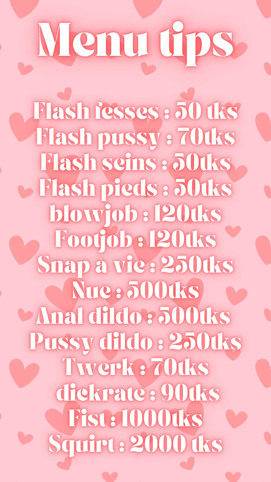Ahegao, Berciuman, Tarian Erotis, Dirty Talk, Doggy Style, Meraba, Di luar ruangan, Blowjob, Memukul, Masturbasi, Anal, Berkedip, Fetish Kaki, Dildo atau Vibrator, Bermain Peran, Instruksi Masturbasi, Topless, Mainan Seks, Striptis, Twerk, Mengepalkan tangan, Strapon, Hardcore, Orgasme, Mandi, Heels, Squirt, Tingkat Penis